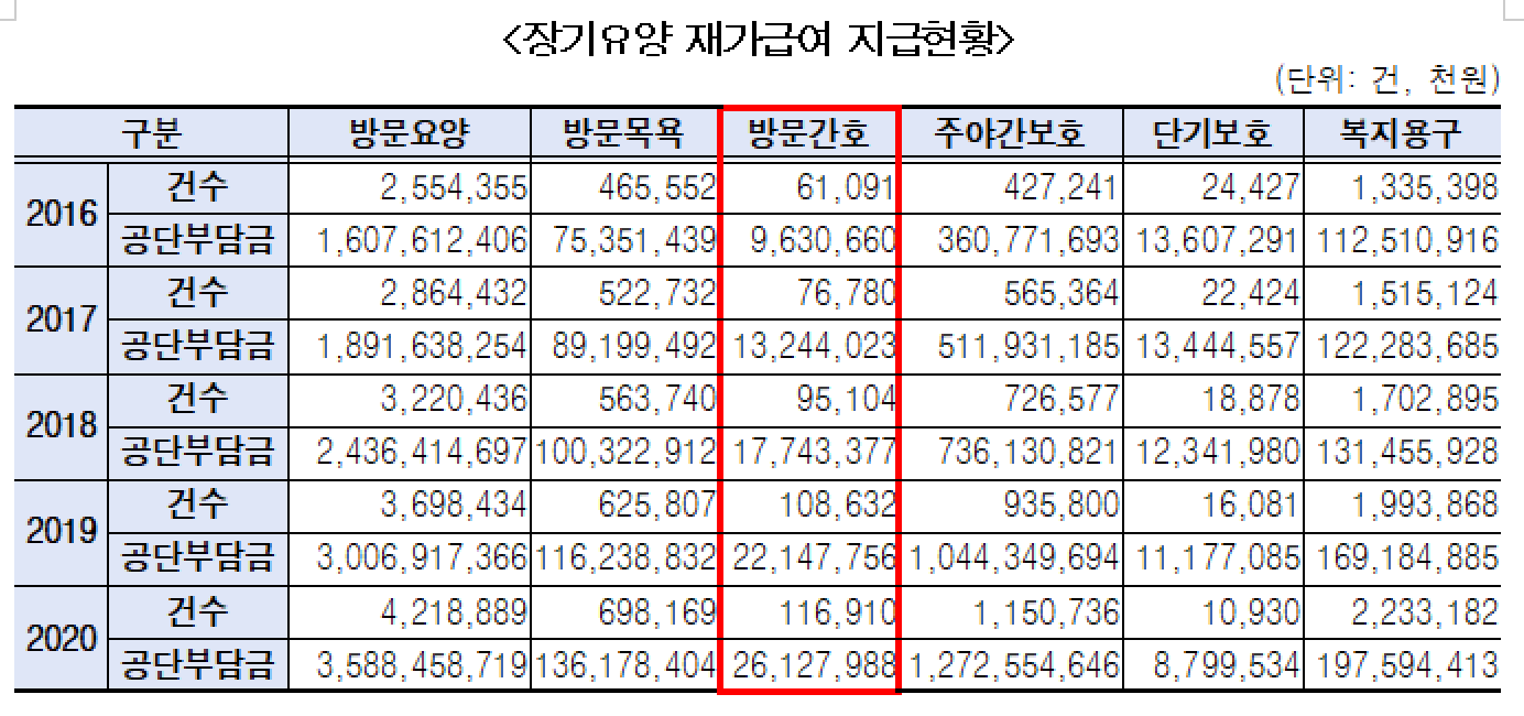 ±è ÀÇ¿øÀÌ ±¹¹Î°Ç°º¸Çè°ø´ÜÀ¸·ÎºÎÅÍ Á¦Ãâ¹ÞÀº ÃÖ±Ù 5³â°£ Àç°¡±Þ¿© ÇöȲÀ» º¸¸é, Àü¹ÝÀûÀ¸·Î ¹æ¹®¿ä¾ç¿¡ ÁýÁß(2020³â 420¸¸¿© °Ç)µÅ ÀÖ´Ù. ±×¿¡ ºñÇØ ¹æ¹®°£È£´Â Áö³ÇØ ±âÁØ 11¸¸¿© °ÇÀ¸·Î Ÿ ¼ºñ½ºµé¿¡ ºñÇØ Çö°ÝÈ÷ ³·Àº ¼öÄ¡¸¦ º¸¿´´Ù.