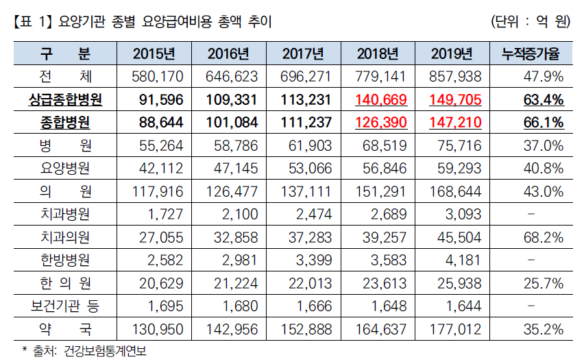 Á¦¾È¼´Â ȯÀÚ ½ò¸² Çö»óµµ ÁöÀûÇß´Ù. »óÁ¾·Á¾º´ µî¿¡¼´Â ȯÀÚ°¡ ÆøÁõÇÏ°í ³ª¸ÓÁö´Â ȯÀÚ°¡ ±Þ°¨Ç߱⠶§¹®ÀÌ´Ù. 2015³âºÎÅÍ 2019³â±îÁö ¿ä¾ç±â°ü Á¾º° ¿ä¾ç±Þ¿©ºñ¿ë ÃÑ¾× ´©Àû Áõ°¡À²Àº ¡ã»óÁ¾ 63.4% ¡ãÁ¾º´ 66.1% ¡ãº´¿ø 37.0% ¡ã¿ä¾çº´¿ø 40.8% ¡ãÀÇ¿ø 43.0% µîÀ¸·Î ³ªÅ¸³µ´Ù.