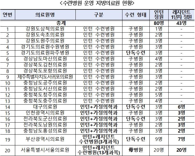 ±¹È¸ º¸°Çº¹ÁöÀ§¿øÈ¸ ±è¼ºÁÖ ÀÇ¿ø(´õºÒ¾î¹ÎÁÖ´ç)¿¡ µû¸£¸é Àüü Áö¹æÀÇ·á¿ø 34°÷ Áß 20°÷¸¸ÀÌ ¼ö·Ãº´¿øÀ¸·Î ÁöÁ¤µÅ ¿î¿µ ÁßÀ̾ú°í, ÀÌÁß 13°÷Àº ÀÎÅÏ ¼ö·Ã¸¸À» ½ÃÇàÇϰí ÀÖ´Â »óȲÀÌ´Ù.