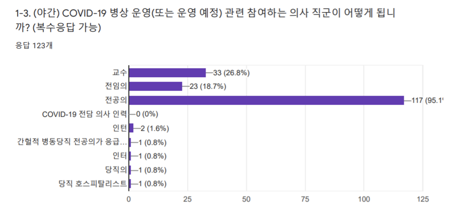 ¼³¹®Á¶»ç °á°ú, Äڷγª19 º´»ó ¿î¿µ°ú °ü·ÃÇØ Âü¿©ÇÏ´Â ÀÇ»ç Á÷±º(º¹¼öÀÀ´ä °¡´É)Àº Àü°øÀÇ(93.5%, 115¸í)¿Í ±³¼ö(92.7%, 114¸í)°¡ °¡Àå ¸¹¾ÒÀ¸¸ç, ÀüÀÓÀÇ(46.3%, 57¸í), ÀÎÅÏ(2.4%, 3¸í) µîÀÌ µÚÀ̾ú´Ù.