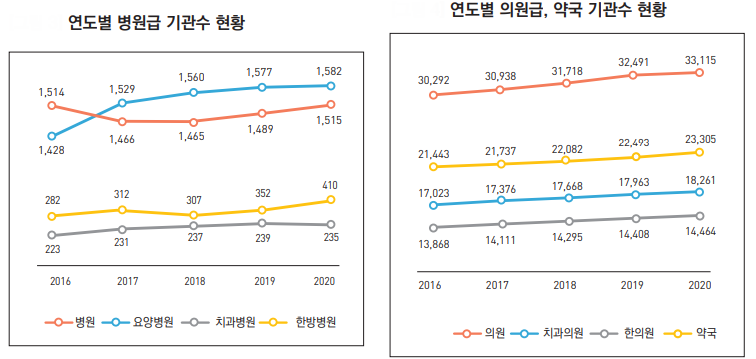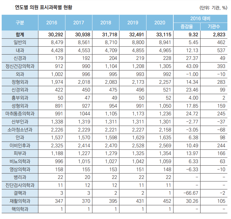2016³âºÎÅÍ 2020³â±îÁö ÀÇ¿ø±Þ ¿ä¾ç±â°ü ¼ö¸¦ ºÐ¼®ÇÑ °á°ú¸¦ º¸¸é, Á¤½Å°Ç°ÀÇÇаú°¡ 912°÷¿¡¼ 1305°÷À¸·Î 43% ´Ã¾î °¡Àå Å« Áõ°¡ÆøÀ» º¸¿´´Ù.