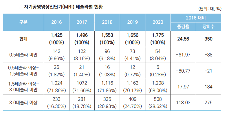 2016³â ´ëºñ Àüü MRI´ë¼ö´Â 24.56% Áõ°¡ÇÑ ¹Ý¸é 0.5Å×½½¶ó ÀÌ»ó~1.5Å×½½¶ó ¹Ì¸¸Àº 80.77%, 0.5 Å×½½¶ó ¹Ì¸¸Àº 61.97% °¨¼ÒÇß´Ù. 3.0Å×½½¶ó ÀÌ»óÀÌ 118.03%, 1.5Å×½½¶ó ÀÌ»ó~3.0Å×½½¶ó¹Ì¸¸ÀÌ 17.97% Áõ°¡Çß´Ù.