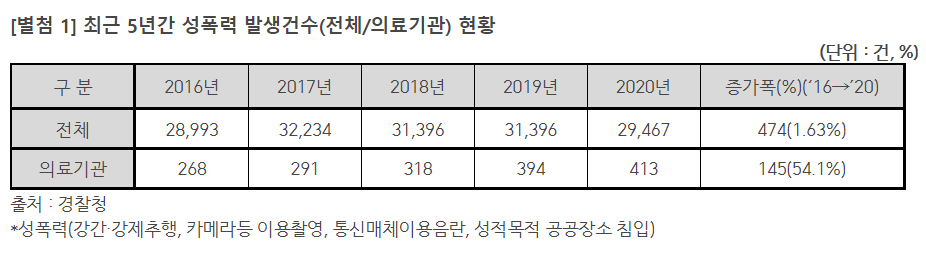 Á¤Ãá¼÷ ÀÇ¿øÀÌ °æÂûûÀ» ÅëÇØ È®º¸ÇÑ ÀÚ·á¿¡ µû¸£¸é ÃÖ±Ù 5³â°£ ÀÇ·á±â°ü ³» ¼ºÆø·ÂÀº Áö¼ÓÀûÀ¸·Î Áõ°¡ÇØ 2016³â 268°Ç¿¡¼ 2020³â 413°ÇÀ¸·Î 54.1%(145°Ç) ´Ã¾ú´Ù.