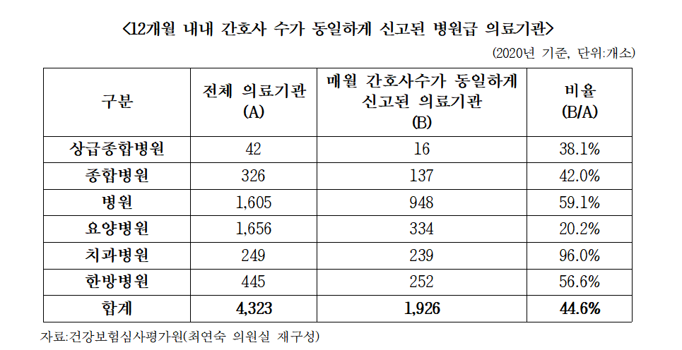 ±¹¹ÎÀÇ´ç ÃÖ¿¬¼÷ ÀÇ¿øÀÌ °Ç°º¸Çè½É»çÆò°¡¿øÀ¸·Î Á¦Ãâ¹ÞÀº 2020³â ¿ùº° ÀÇ·á±â°ü °£È£»ç ½Å°í ÇöȲ¿¡ ÀÇÇϸé, º´¿ø±Þ ÀÇ·á±â°ü 4323°³¼Ò Áß 44.6%ÀÎ 1926°³¼Ò¿¡¼ 1³â ³»³» °£È£»ç ¼ýÀÚ°¡ µ¿ÀÏÇÑ ¼öÄ¡·Î ½Å°íµÆ´Ù.