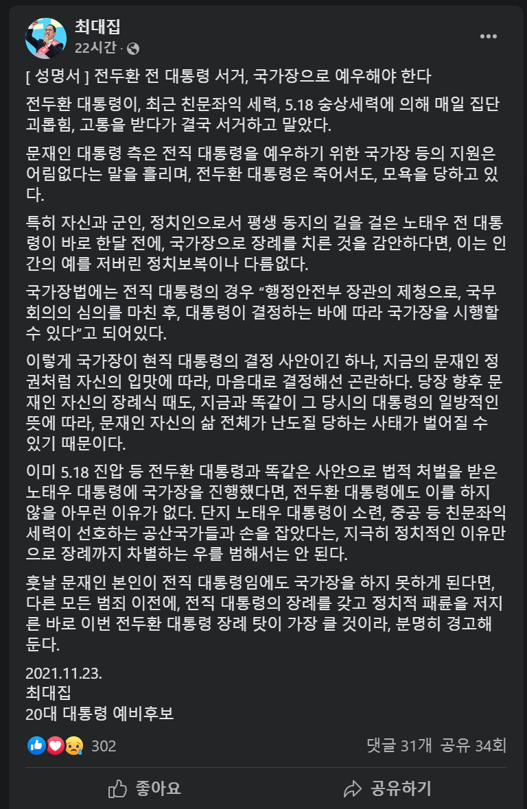 ÃÖ´ëÁý Àü ȸÀåÀº Áö³ 23ÀÏ ÀÚ½ÅÀÇ »çȸ°ü°è¸Á¼ºñ½º(SNS)¸¦ ÅëÇØ ‘ÀüµÎȯ Àü ´ëÅë·É ¼°Å, ±¹°¡ÀåÀ¸·Î ¿¹¿ìÇØ¾ß ÇÑ´Ù’´Â Á¦¸ñÀÇ ¼º¸í¼¸¦ ¿Ã·È´Ù. ±×´Â ±Ý³â 7¿ù ³»³â 3¿ù Ä¡·ïÁö´Â 20´ë ´ë¼± Ã⸶¸¦ ¼±¾ðÇÏ°í ¿¹ºñÈ帷Πµî·ÏÇÏ¸é¼ Á¤Ä¡ÀÎ Çຸ¸¦ °È°í ÀÖ´Ù.