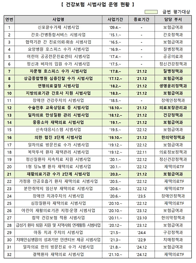 ¿ÃÇØ »ç¾÷ÀÌ Á¾·áµÇ´Â ½Ã¹ü»ç¾÷Àº 9°³´Ù. 2017³â¿¡´Â 8¿ù Áúº´Á¤Ã¥°ú ‘ÀÚ¹®Çü È£½ºÇǽº ¼ö°¡ ½Ã¹ü»ç¾÷’°ú 12¿ù º¸Çè±Þ¿©°ú ‘»ó±ÞÁ¾ÇÕº´¿ø ½ÉÃþÁøÂû ¼ö°¡ ½Ã¹ü»ç¾÷’µµ óÀ½ °³½ÃµÆ´Ù.