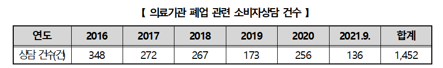Çѱ¹¼ÒºñÀÚ¿ø(¿øÀå Àå´öÁø)Àº 1372¼ÒºñÀÚ»ó´ã¼¾ÅÍ¿¡ Á¢¼öµÈ ÀÇ·á±â°ü Æó¾÷ °ü·Ã ¼ÒºñÀÚ»ó´ãÀ» È®ÀÎÇÑ °á°ú, ÃÖ±Ù 6³â¿©°£(’16³â ~ ’21³â 9¿ù) ÃÑ 1452°ÇÀÌ Á¢¼öµÆ´Âµ¥ ÀÌ Áß ¼±³³Ä¡·áºñ ȯ±Þ °ü·Ã »ó´ãÀÌ 70.0%(1,015°Ç)·Î °¡Àå ¸¹¾Ò´Ù°í 1ÀÏ ¹àÇû´Ù.
