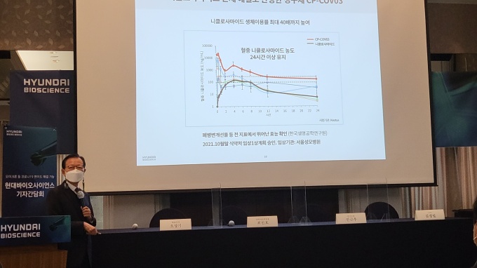 Çö´ë¹ÙÀÌ¿À´Â 7ÀÏ ¿ÀÀü ¼¿ï ÇÁ·¹½º¼¾ÅÍ¿¡¼ ±âÀÚ°£´ãȸ¸¦ ¿°í °úÇбâ¼úÁ¤º¸Åë½ÅºÎ »êÇÏ Çѱ¹»ý¸í°øÇבּ¸¿ø(KRIBB)ÀÌ À§Å¹ ¼öÇàÇÑ Äڷγª19 µ¿¹°½ÃÇè¿¡¼ ÀÚ»çÀÇ Äڷγª19 Ä¡·áÁ¦ Èĺ¸¹°Áú CP-COV03¿Í Ç׿°ÁõÁ¦ µ¦»ç¸ÞŸ¼Õ º´¿ë¿ä¹ýÀÌ µ¦»ç¸ÞŸ¼Õ ´Üµ¶¿ä¹ý ´ëºñ 2.1¹è Ä¡·áÈ¿°ú¸¦ º¸¿´´Ù°í ¹ßÇ¥Çß´Ù.