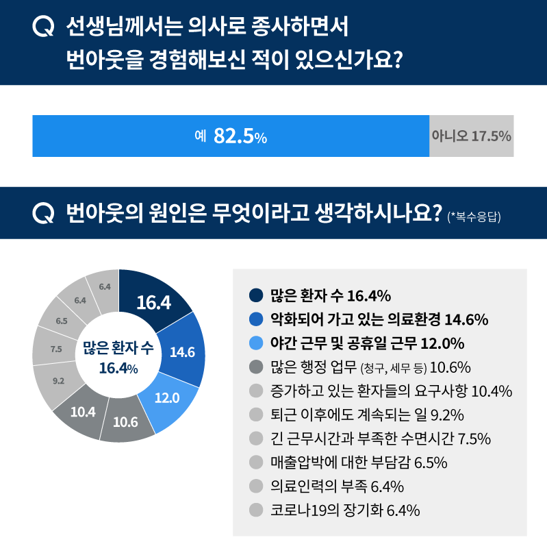 ¹ø¾Æ¿ô ¿øÀÎÀ¸·Î´Â ‘¸¹Àº ȯÀÚ ¼ö’(16.4%), ‘¾Çȵǰí ÀÖ´Â ÀÇ·áȯ°æ’(14.6%), ‘¾ß°£ ±Ù¹« ¹× °øÈÞÀÏ ±Ù¹«’(12.0%), ‘¸¹Àº ÇàÁ¤ ¾÷¹«’(10.6%) ¹× Áõ°¡Çϰí Àִ ȯÀÚµéÀÇ ¿ä±¸»çÇ×’(10.4%) ¼øÀ¸·Î ÀÀ´äÇß´Ù.