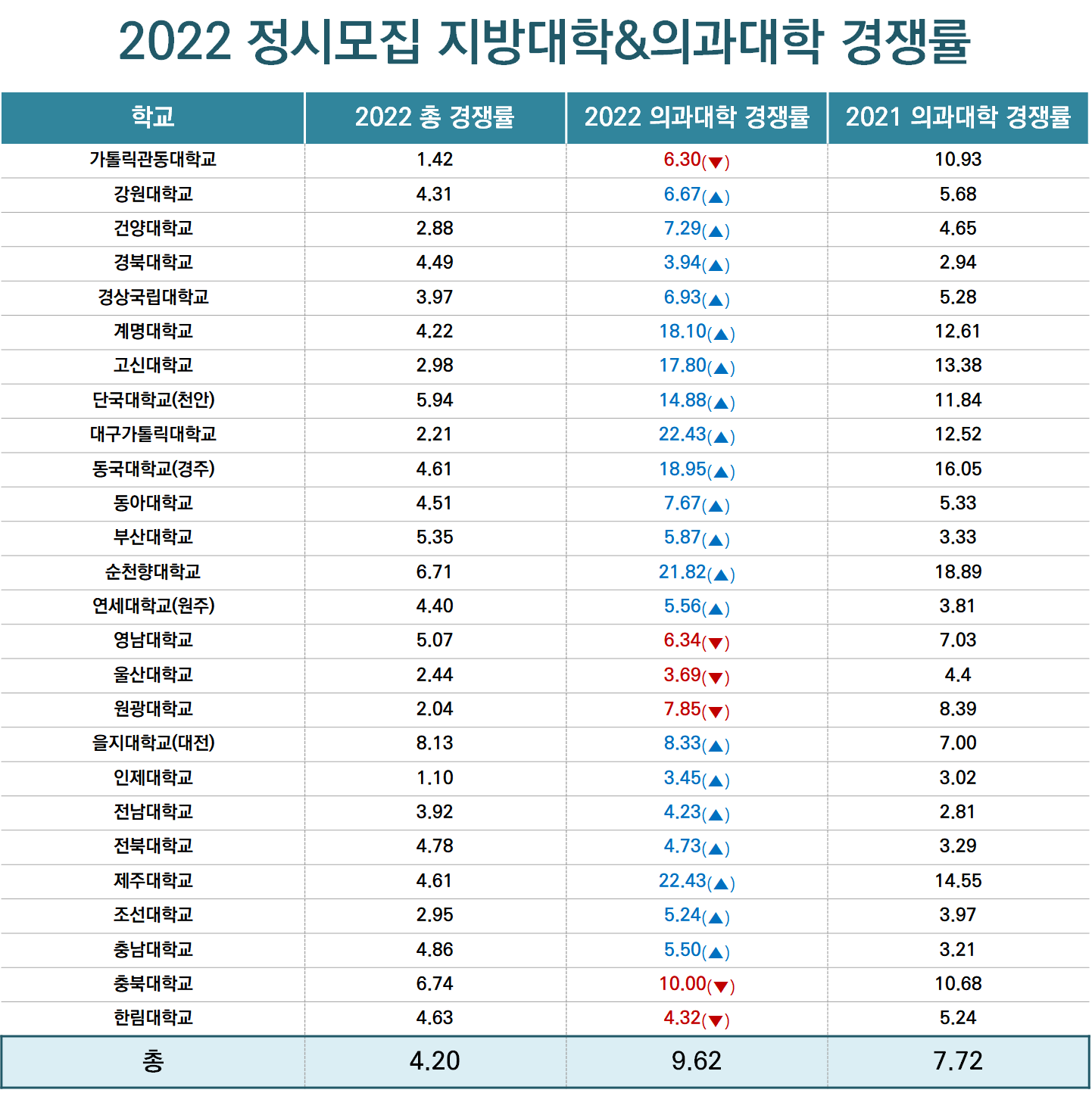 µ¥Àϸ®¸Þµð°¡ 2022 Á¤½Ã¸ðÁý °á°ú¸¦ ºÐ¼®ÇÑ °á°ú, Àǰú´ëÇÐ Á¤¿øÀ» ¸ðÁýÇÑ Áö¹æ´ëÇÐ Æò±Õ °æÀï·üÀº 4.20´ë 1ÀÎ ¹Ý¸é, ÇØ´ç ´ëÇÐÀÇ ÀÇ´ë Æò±Õ °æÀï·üÀº 9.62´ë 1·Î µÎ ¹è¸¦ Èǽ ³Ñ¾ú´Ù.