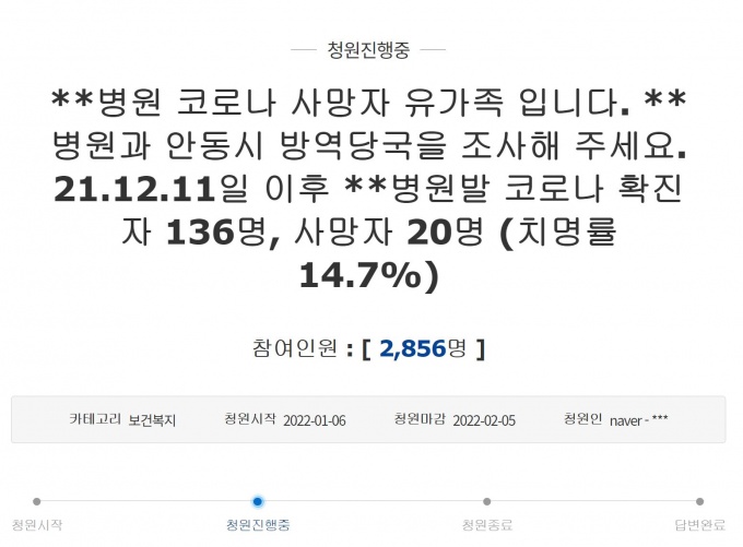10ÀÏ Ã»¿Í´ë ±¹¹Îû¿ø °Ô½ÃÆÇ¿¡´Â ‘¾Èµ¿º´¿ø Äڷγª19 »ç¸ÁÀÚ À¯°¡Á·ÀÔ´Ï´Ù. ¾Èµ¿º´¿ø°ú ¾Èµ¿½Ã ¹æ¿ª´ç±¹À» Á¶»çÇØ ÁÖ¼¼¿ä’¶ó´Â Á¦¸ñÀÇ Ã»¿øÀÌ °ÔÀçµÆ´Ù.