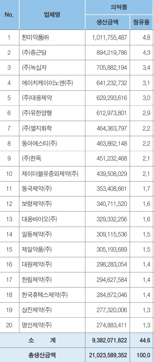 [µ¥Àϸ®¸Þµð ¾çº¸Çý ±âÀÚ] ±¹³» Àüü ÀǾàǰ »ý»ê ½ÇÀû 1À§´Â 'Çѹ̾àǰ'À¸·Î ³ªÅ¸³µ´Ù. ´ÜÀÏǰ¸ñ »ý»ê½ÇÀûÀº ¹é½Å Áß½ÉÀÎ 'SK¹ÙÀÌ¿À»çÀ̾ð½º'¿Í 'GC³ì½ÊÀÚ'°¡ ¼±ÀüÇß´Ù.
