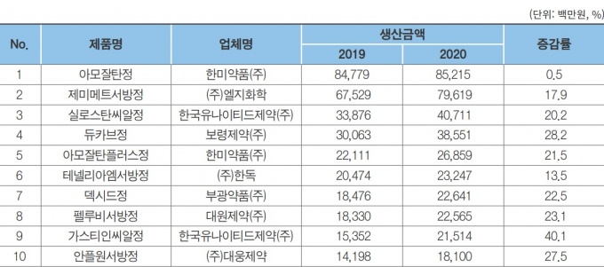 3À§´Â Çѱ¹À¯³ªÀÌÆ¼µåÁ¦¾àÀÇ '½Ç·Î½ºÅº¾¾¾Ë'·Î 20.2% ¼ºÀåÇÑ 407¾ï¿øÀÇ »ý»ê½ÇÀûÀ» º¸¿´°í, ¶Ç ´Ù¸¥ ǰ¸ñÀÎ '°¡½ºÆ¼Àξ¾¾Ë' ¿ª½Ã 2019³âº¸´Ù 40.1% ¼ºÀåÇÑ 215¾ï¿øÀ¸·Î 9À§ ÀÚ¸®¸¦ ²çá´Ù.