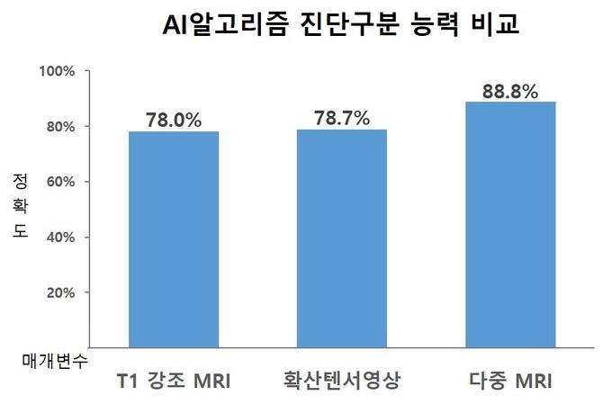 ±× °á°ú ´ÙÁß MRI ¸ðµ¨¿¡¼ Á¤È®µµ 88.8%, ¹Î°¨µµ 93.0%, ƯÀ̵µ 83.8%·Î ³ôÀº Áø´Ü ±¸ºÐ ´É·ÂÀ» º¸¿©Áá´Ù.