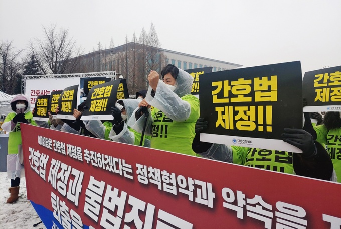 ´ëÇѰ£È£Çùȸ(ȸÀå ½Å°æ¸²)´Â Áö³ÇØ 11¿ù °£È£¹ý Á¦Á¤ Ã˱¸ Àü±¹ °£È£»ç °áÀÇ´ëȸ¸¦ ½ÃÀÛÀ¸·Î, µÎ ´Þ °¡±îÀÌ ±¹È¸ ¾Õ¿¡¼ °£È£¹ý Á¦Á¤ Ã˱¸ Áýȸ¸¦ À̾°í ÀÖ´Ù.