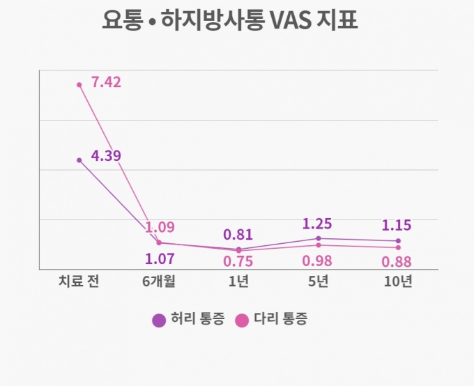 ±× °á°ú, Ä¡·áÈ¿°ú°¡ 10³â°£ À¯ÁöµÈ °ÍÀÌ È®ÀεƴÙ. ¸ÕÀú 10³â ÃßÀû°üÂû¿¡¼ ÇÏÁö¹æ»çÅë VAS´Â Ä¡·á Àü ½ÉÇÑ ÅëÁõ ¼öÁØÀÎ 7.42°¡ 6°³¿ù ÈÄ 1Á¡´ë·Î ¶³¾îÁø ÈÄ 10³â ÈıîÁö 0.88·Î ¾ÈÁ¤ÀûÀ¸·Î À̾îÁö°í ÀÖ¾ú´Ù.