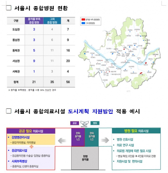 ¼¿ï½Ã³» Á¾ÇÕº´¿øÀº ÃÑ 56°³¼Ò´Ù. ÀÌÁß 21°³¼Ò´Â ¿ëÀû·üÀÌ ºÎÁ·ÇØ °¨¿°º´ °ü¸®½Ã¼³ ÁõÃà µî ÀÇ·á½Ã¼³À» È®ÃæÇϱ⠾î·Á¿î »óȲÀÌ´Ù. Áö³´Þ ¸» °³Á¤µÈ ±¹ÅäºÎÀÇ '±¹Åä°èȹ¹ý ½ÃÇà·É'µµ ¿ÏÈµÈ ¿ëÀû·üÀ» ¸ðµÎ °¨¿°º´ °ü¸®½Ã¼³·Î¸¸ ¼³Ä¡ÇÏ°Ô µÅ ÀÖ´Ù.