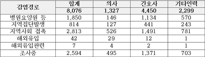 ÀÌ¾î º´¿ø·¿ä¾ç¿ø µî 1850¸í(ÀÇ»ç 146¸í·°£È£»ç 1134¸í·±âŸÀη 570¸í), Áö¿ªÁý´Ü¹ß»ý 814¸í(ÀÇ»ç 127¸í·°£È£»ç 441¸í·±âŸÀη 243¸í), ÇØ¿ÜÀ¯ÀÔ 42¸í(ÀÇ»ç 29¸í·°£È£»ç12¸í·±âŸÀη 1¸í), ÇØ¿ÜÀ¯ÀÔ °ü·Ã 7¸í(ÀÇ»ç 4¸í·°£È£»ç 2¸í·±âŸÀη 1¸í) µîÀ¸·Î È®ÀεƴÙ.