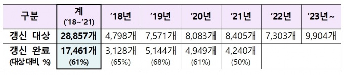 2021³â±îÁö Áö³ 4³â°£ ǰ¸ñ°»½ÅÀÌ ÁøÇàµÈ 2¸¸8857°³ ǰ¸ñ Áß 1¸¸7461°³ ǰ¸ñ(61%)ÀÇ °»½ÅÀÌ ¿Ï·áµÆÀ¸³ª, 1¸¸1396°³ ǰ¸ñ(39%)Àº À¯È¿±â°£ ¸¸·á µîÀ¸·Î Á¤¸®µÆ´Ù.