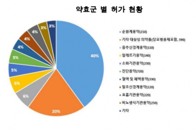 ¶Ç ¾àÈ¿º° Çã°¡ ÇöȲÀº ¡ã¼øÈ¯°è ÀǾàǰ(Ç÷¾Ð°ÇÏÁ¦, µ¿¸Æ°æÈ¿ëÁ¦) 50ǰ¸ñ(40.0%) ¡ã´ë»ç¼º ÀǾàǰ(´ç´¢º´¿ëÁ¦ µî) 25ǰ¸ñ(20.0%) ¡ãÁßÃ߽Űæ°è ÀǾàǰ 8ǰ¸ñ(6.4%) ¡ã¾Ë·¹¸£±â ÀǾàǰ 7ǰ¸ñ(5.6%) ¡ã¼Òȱâ°ü ÀǾàǰ 6ǰ¸ñ(4.8%) ¼øÀÌ´Ù.