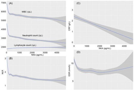 ÀÌ·± Çö»óÀº NK¼¼Æ÷ Ȱ¼ºµµ°¡ Á¤»ó ÀÌÇÏ(<500pg/mLÀÌÇÏ)¿¡¼ ¶Ñ·ÇÇßÀ¸¸ç ¸Å¿ì ³·Àº ±º(<100pg/mLÀÌÇÏ)¿¡¼ µÎµå·¯Áö°Ô ³ªÅ¸³µ´Ù. NK¼¼Æ÷ Ȱ¼ºµµ°¡ ³·À»¼ö·Ï ü³» ¿°Áõ¹ÝÀÀÀÌ ³ô¾ÆÁø´Ù´Â Àǹ̴Ù.