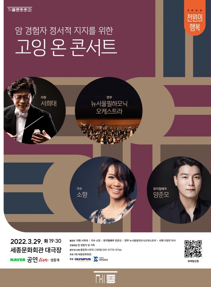 ‘°íÀ× ¿Â’ ÄܼƮ´Â ¿Ã¸²Çª½ºÇѱ¹°ú ´ëÇѾÏÇùȸ, ±×¸®°í ¼¼Á¾¹®Èȸ°ü°ú ÇÔ²² ÇÏ´Â °ü°´ ¸ÂÃãÇü À½¾Çȸ´Ù. ¾Ï °æÇèÀÚ¿¡ ´ëÇÑ »çȸÀû °ø°¨´ë Çü¼º°ú Á¤¼Àû ÁöÁö¸¦ À§ÇÑ ‘°íÀ× ¿Â Ä·ÆäÀÎ’ ÇÁ·Î±×·¥ Áß Çϳª·Î ±âȹµÆ´Ù.