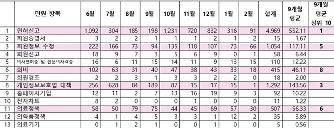 °¡Àå ¸¹Àº ¹Î¿øÀº ¸éÇã½Å°í 4969°ÇÀ̾ú°í, °¨¿°º´¿¹¹æ´ëÃ¥ 2713°Ç, °³ÀÎÁ¤º¸º¸È£¹ý ´ëÃ¥ 1292°Ç, ¿¬¼ö±³À° 1115°Ç, ȸ¿øÁ¤º¸ ¼öÁ¤ 1054°Ç, ÀÇ·áÁ¤Ã¥ 507°Ç, ÀÇ·á°¨Á¤ 419°Ç, ȸºñ 415°Ç, ÀÇÇù½Å¹®(±¸µ¶·±¤°í µî) 379°Ç, Á¾ÇÕÇмú´ëȸ 189°Ç µîÀ̾ú´Ù.