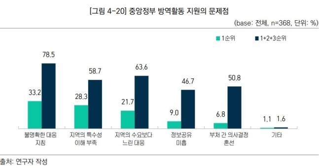 Äڷγª19 ´ëÀÀ¿¡ ÀÖ¾î Áß¾ÓÁ¤ºÎÀÇ ¹æ¿ª Ȱµ¿ Áö¿ø ¹®Á¦Á¡À» 3°³ ²Åµµ·Ï Çߴµ¥, 'ºÒ¸íÈ®ÇÑ ´ëÀÀ Áöħ'ÀÌ 78.5%(1¼øÀ§´Â 33.2%)·Î °¡Àå ³ô¾Ò´Ù.