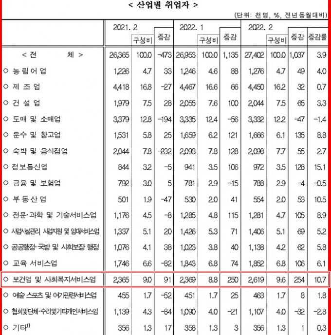 16ÀÏ Åë°èû¿¡ µû¸£¸é 2¿ù º¸°Ç¾÷ ¹× »çȸº¹Áö¼ºñ½º¾÷ Ãë¾÷ÀÚ´Â Àü³â µ¿¿ù ´ëºñ 25¸¸4000¸í(10.7%) ´Ã¾ú´Ù.