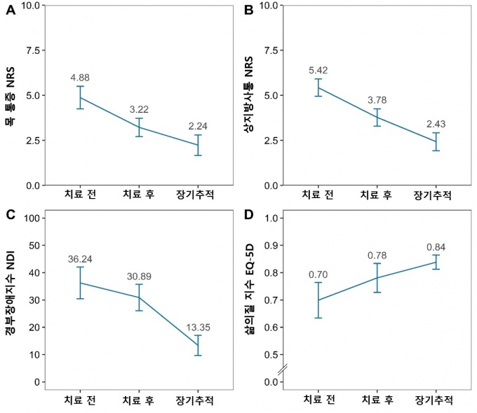NDI ÁöÇ¥ÀÇ °æ¿ì Áߵ Àå¾Ö ¼öÁØÀÎ 36.24ÀÌ Ä¡·á ÈÄ 30.89·Î ¼ÒÆø °³¼±µÆ´Ù. ¶ÇÇÑ »îÀÇ Áú¿¡¼µµ EQ-5D °ªÀº 0.70¿¡¼ 0.78·Î ¿Ã¶ó ±àÁ¤ÀûÀÎ º¯È°¡ È®ÀεƴÙ.