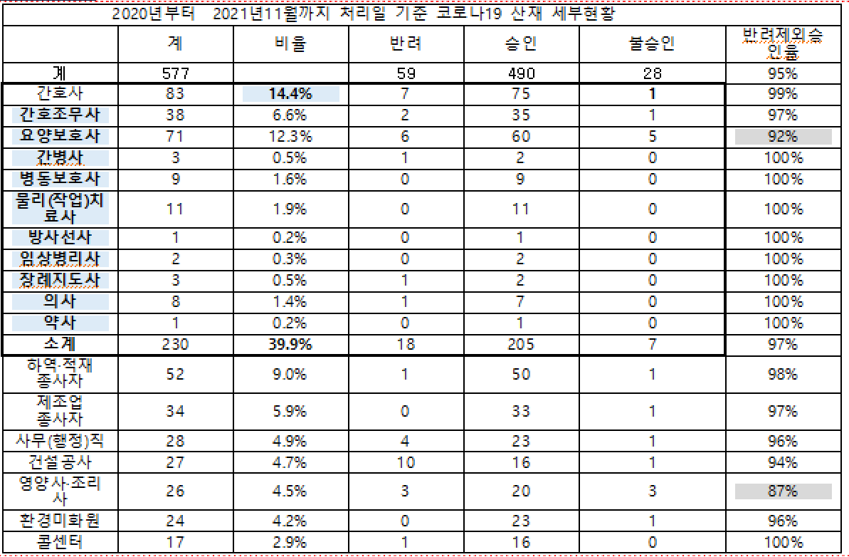 [µ¥Àϸ®¸Þµð ¹ÚÁ¤¿¬ ±âÀÚ] Äڷγª19 »çÅ ÀÌÈÄ ±Ù·Îº¹Áö°ø´Ü¿¡ Á¢¼öµÈ »ê¾÷ÀçÇØ ½Åû Áß 40%´Â º´¿ø Á¾»çÀÚÀÎ °ÍÀ¸·Î ³ªÅ¸³µ´Ù. Á÷Á¾º°·Î »ìÆìº¸¸é °£È£»ç¿Í °£È£Á¶¹«»ç¸¦ ÇÕÇÑ °£È£Àη ½ÅûÀÌ 20%Á¤µµ µÆ´Ù. Àǻ簡 Á¢¼öÇÑ »êÀç½ÅûÀº 1% Á¤µµ·Î Á¶»çµÆ´Ù. 29ÀÏ ¿ëÇýÀÎ ±âº»¼Òµæ´ç ÀÇ¿øÀº ÃÖ±Ù ±Ù·Îº¹Áö°ø´ÜÀ¸·ÎºÎÅÍ Á¦Ãâ¹ÞÀº ‘2020~2021³â 11¿ù Äڷγª19 »êÀçÇöȲ’À» ÀڷḦ ºÐ¼®ÇÑ °á°ú À̰°ÀÌ ³ªÅ¸³µ´Ù°í ¹àÇû´Ù. Äڷγª19 »êÀç½ÅûÀº 2020³â 156°Ç...