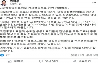 [µ¥Àϸ®¸Þµð °íÀç¿ì ±âÀÚ] ¿øÈñ·æ ±¹¹ÎÀÇÈû ¼±´ëÀ§ Á¤Ã¥ÃѰýº»ºÎÀå(îñ Á¦ÁÖµµÁö»ç)°¡ 20ÀÏ ±¹¸³Áß¾ÓÀÇ·á¿ø(NMC)À» Äڷγª19 ±ä±Þº´µ¿À¸·Î Àü¸é ÀüȯÇ϶ó°í Ã˱¸. ¿ø Á¤Ã¥ÃѰýº»ºÎÀåÀº À̳¯ SNS¸¦ ÅëÇØ “Áö±ÝÀÇ »çÅ´ ±ä±ÞÇϰí ÃÑ·ÂÀûÀÎ ´ëÀÀÀ» ¿ä±¸Çϰí ÀÖ´Ù”¸ç “NMC¿Í ¼öµµ±Ç °ø°øÀÇ·á±â°üÀÇ Àü(îï) º´µ¿À» ¸ðµÎ Äڷγª ÁßÁõȯÀÚ º´»óÀ¸·Î Áï°¢ ÀüȯÇϰí, °£±ÞÀ̵¿º´»óÀÇ °¡´É¼ºµµ Àû±ØÀûÀ¸·Î °ËÅäÇ϶ó"°í Ã˱¸. ¾Õ¼ ¼¿ï´ëº´¿øÀº Äڷγª Áß...