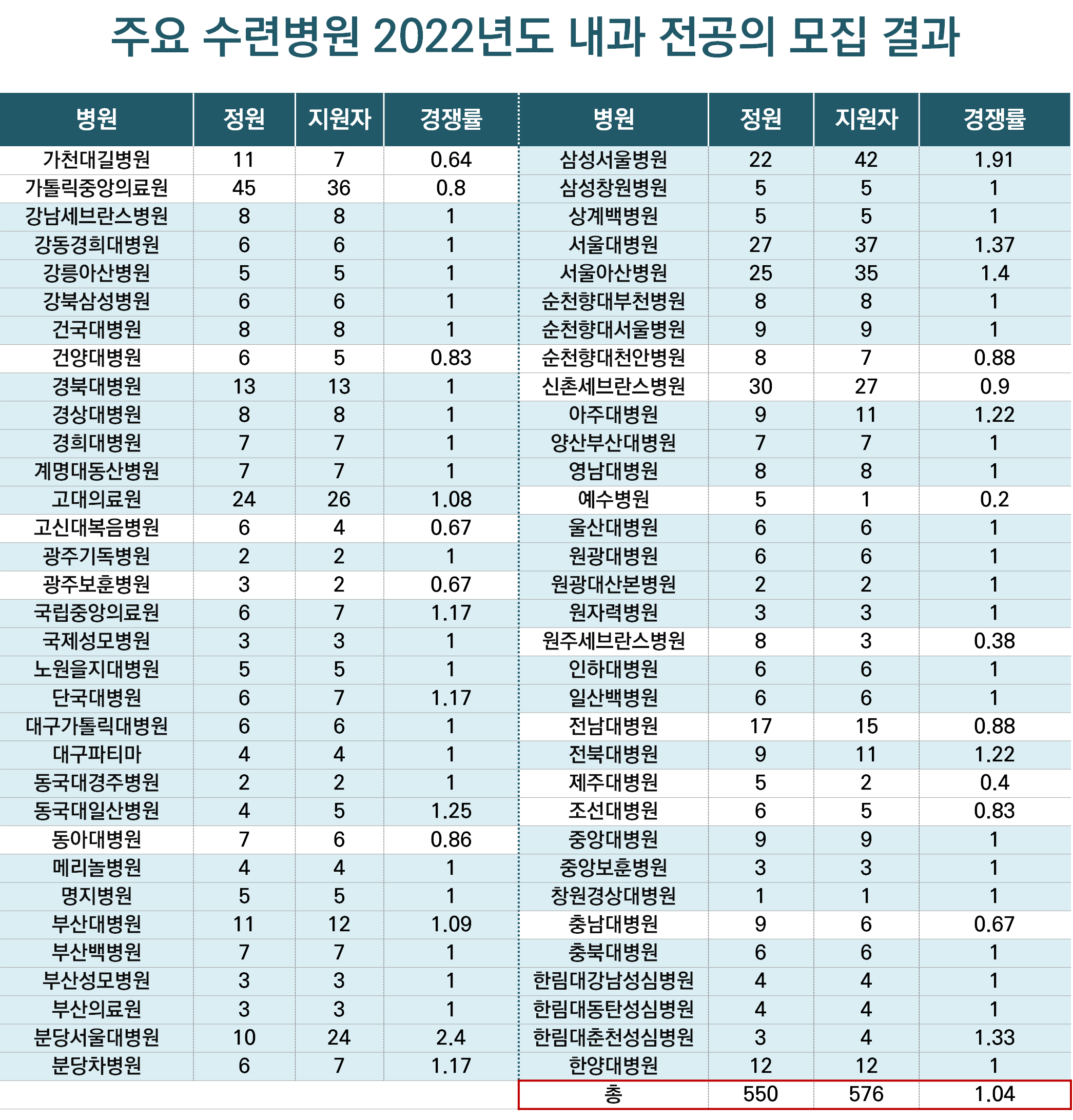 [µ¥Àϸ®¸Þµð ¹ÚÁ¤¿¬‧ÀÓ¼ö¹Î ±âÀÚ] 2022³âµµ Àü¹Ý±â Àü°øÀÇ ¸ðÁý¿¡¼ ³»°ú°¡ ¸¸Á·½º·¯¿î ¼ºÀûÇ¥¸¦ ¹Þ¾Æµé¾ú´Ù. ³»¿Ü»ê¼ÒÀÇ ´Ù¸¥ Àü¹®°ú¸ñµéÀÌ ¹Ì´Þ»çŸ¦ ¸éÄ¡ ¸øÇÑ °¡¿îµ¥ ³»°úÀÇ ¼±ÀüÀº ÀÇ·á°è °ü½ÉÀ» ²ø°í ÀÖ´Ù. 13ÀÏ º´¿ø°è¿¡ µû¸£¸é 2022³â Àü¹Ý±â ·¹Áö´øÆ® ¸ðÁýÀº Áö³ 9ÀÏ Áö¿øÀÚ ¼·ùÁ¢¼ö¸¦ ¸¶°¨Çß´Ù. 2022³â Àü¹Ý±â ·¹Áö´øÆ® ¸ðÁý¿¡¼ µ¥Àϸ®¸Þµð°¡ 86°³ ¼ö·Ãº´¿øÀÇ Ãæ¿øÀ²À» Á¶»çÇÑ °á°ú, 104.7%·Î ³ªÅ¸³µ´Ù. 550¸í Á¤¿ø¿¡ 576¸íÀÌ Áö¿øÇØ °æÀï·üÀº ...