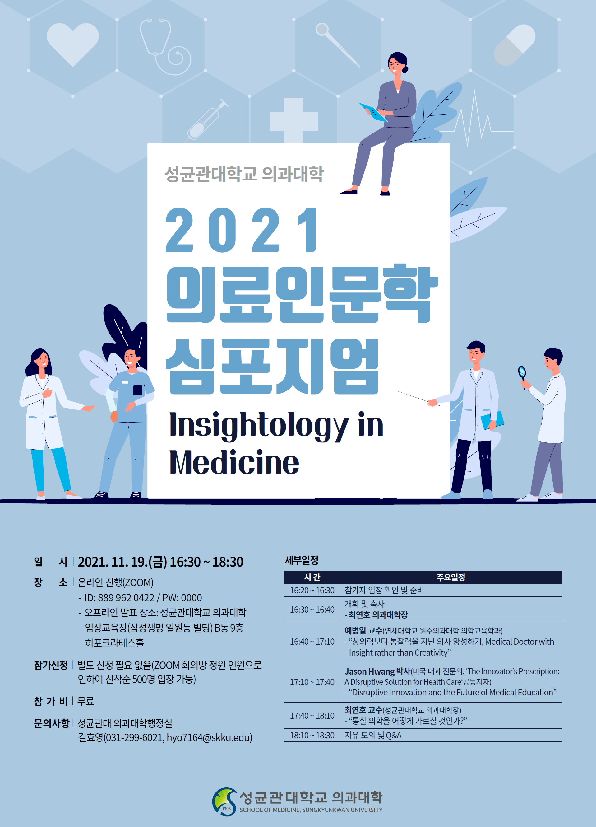 [µ¥Àϸ®¸Þµð ¹ÚÁ¤¿¬ ±âÀÚ] ¼º±Õ°ü´ëÇб³ Àǰú´ëÇÐ(ÇÐÀå ÃÖ¿¬È£)Àº ¿À´Â 19ÀÏ ÀÇ·áÀι®ÇÐ½ÉÆ÷Áö¾ö ÅëÂûÀÇÇÐ (Insightology in Medince)À» °³ÃÖÇÑ´Ù°í ¹àÇû´Ù. ÃÖ¿¬È£ ÇÐÀåÀº À̹ø ÁÖÁ¦ÀÎ ÅëÂûÀÇÇп¡ ´ëÇØ "´Ü¼øÇÑ ÀÇÇÐÀû Áö½ÄÀÌ ¾Æ´Ñ ȯÀÚ°¡ °®°í ÀÖ´Â ¸Æ¶ôÀ» ÀÌÇØÇØ Ç®¾î³»´Â ÀÇÇÐÀû ÁöÇý¸¦ ÀǹÌÇÑ´Ù"¸ç "¼º´ëÀÇ´ë¿¡¼ ±¹³» óÀ½À¸·Î ÀÌ ÁÖÁ¦¸¦ ´Ù·ç°íÀÚ ÇÑ´Ù"°í ¸»Çß´Ù. À̾î "¿Ã¹Ù¸¥ ÀÓ»óÀû Ãß·ÐÀº ´Ü¼øÇÑ Áö½ÄÀ¸·Î¸¸ ÀÌ·ïÁöÁö ¾ÊÀ¸¸ç, ÀÇÇÐ...