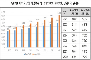 [µ¥Àϸ®¸Þµð ¾çº¸Çý ±âÀÚ] ±Û·Î¹ú ¹ÙÀÌ¿À»ê¾÷ÀÌ Äڷγª19 ¿µÇâÀ¸·Î ´õ ºü¸£°Ô ¼ºÀåÇÒ °ÍÀ¸·Î ¿¹»óµÈ´Ù. ±¹°¡»ý¸í°øÇÐÁ¤Ã¥¿¬±¸¼¾ÅÍÀÇ ±Û·Î¹ú ¹ÙÀÌ¿À»ê¾÷½ÃÀå ÇöȲ º¸°í¼¿¡ µû¸£¸é Äڷγª ÀÌÈÄ ±Û·Î¹ú ¹ÙÀÌ¿À»ê¾÷ ½ÃÀå ±Ô¸ð´Â 2021³â 5837¾ï ´Þ·¯¿¡¼ 2027³â 9113¾ï ´Þ·¯(¾à 1074Á¶¿ø)·Î Áõ°¡ÇÒ Àü¸ÁÀÌ´Ù. Äڷγª19 »çŰ¡ ¾ø¾ú´Ù¸é ¿¬Æò±Õ 6.2% ¼ºÀå·üÀ» º¸¿© ¿ÃÇØ 4889¾ï ´Þ·¯(576¾ï¿ø)¿¡¼ 2027³â 7034¾ï ´Þ·¯ (829¾ï¿ø)·Î Ä¿Áö°ÚÁö¸¸, ½ÅÁ¾ °¨¿°º´ µîÀåÀ¸·Î ¼ºÀå·üÀÌ...