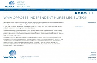 [µ¥Àϸ®¸Þµð À̽½ºñ ±âÀÚ] ¼¼°èÀÇ»çȸ(WMA)°¡ ±¹³» °£È£´Üµ¶¹ý Á¦Á¤ ½Ãµµ¿¡ ´ëÇØ °ø½ÄÀûÀ¸·Î ¹Ý´ë ÀÔÀåÀ» Ç¥¸íÇß´Ù. 10ÀÏ ´ëÇÑÀÇ»çÇùȸ(ÀÇÇù)¿¡ µû¸£¸é Áö³ 9ÀÏ ÇÁ¶û½º ÆÄ¸®¿¡¼ ¿¸° WMA ÀÌ»çȸ¿¡¼ “°£È£»ç°¡ ÀÇ»ç¿Í µ¶¸³ÀûÀ¸·Î ÀÇ·áÇàÀ§¸¦ ÇÒ ¼ö ÀÖµµ·Ï ÇÏ´Â ´ëÇѹα¹ ÀÔ¹ýºÎÀÇ ½Ãµµ¿¡ ´ëÇØ Áï°¢ ¹Ý´ëÇÑ´Ù”´Â ³»¿ëÀÇ °ø½Ä ¼º¸íÀÌ Ã¤ÅõƴÙ. WMA´Â “Çѱ¹ÀÇ °£È£´Üµ¶¹ý Á¦Á¤ ½Ãµµ´Â ÃÖ¼±ÀÇ Áø·á ¿øÄ¢¿¡ À§¹èµÇ´Â ÇàÀ§ÀÌ¸ç ±âÁ¸ÀÇ ÆÀ ±â¹Ý ÀǷḦ...