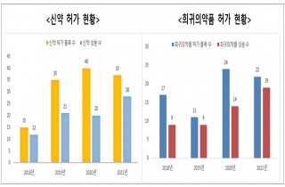 [µ¥Àϸ®¸Þµð ¾çº¸Çý ±âÀÚ] Áö³ÇØ ±¹³» °³¹ß Çã°¡ ½Å¾àÀº 5°³·Î ¿ª´ë Ãִ븦 ±â·ÏÇß´Ù. ½ÄǰÀǾàǰ¾ÈÀüó(óÀå ±è°¸³)´Â Áö³ÇØ ÀǾàǰ Çã°¡·½Å°í ÇöȲÀ» ´ãÀº ‘2021³â ÀǾàǰ Çã°¡ º¸°í¼’¸¦ 7ÀÏ ¹ß°£Çß´Ù. ÀÛ³â ÀǾàǰ Çã°¡·½Å°íµÈ ǰ¸ñÀº ÃÑ 2270°³ ǰ¸ñÀ¸·Î, ¿ÏÁ¦´Â 1992°³(87.7%), ¿ø·á´Â 83°³(3.7%), ÇѾàÀç´Â 195°³(8.6%)´Ù. ¿ÏÁ¦ °¡¿îµ¥ Àü¹®ÀǾàǰÀº 1542°³(77.4%), ÀϹÝÀº 450°³(22.6%)´Ù. ½Å¾àÀº 37°³ ǰ¸ñ(28°³ ¼ººÐ)ÀÌ Çã...