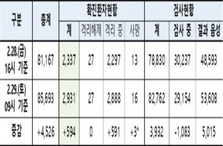 [µ¥Àϸ®¸Þµð °íÀç¿ì ±âÀÚ] Äڷγª19 °¨¿°ÀÚ ¼ö°¡ Å©°Ô ´Ã¾ú´Ù. Àü³¯(28ÀÏ) ¿ÀÈÄ 4½Ã º¸´Ù 594¸íÀÌ Áõ°¡Çß°í, ´©Àû È®ÁøÀÚ´Â ÃÑ 2020-02-29 10:48:02