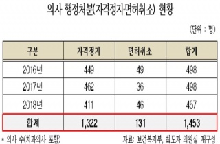 [µ¥Àϸ®¸Þµð °íÀç¿ì ±âÀÚ] ÃÖ±Ù 3³â µ¿¾È °¢Á¾ ÀÇ·á¹ý À§¹ÝÇøÀÇ·Î ÀÚ°ÝÁ¤Áö·¸éÇãÃë¼Ò µÈ ÀÇ»ç ¼ö°¡ 1453¸í¿¡ ´ÞÇÏ´Â °Í.2019-06-18 12:12:48