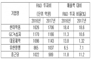 ±¹³» »óÀ§ Á¦¾à»ç Áß Çѹ̾àǰÀÌ ¿¬±¸°³¹ß(R&D) ºñ¿ë ÁöÃâÀ» °¡Àå ¸¹ÀÌ Çϰí ÀÖ´Â °ÍÀ¸·Î È®ÀεƴÙ. 5ÀÏ Á¦¾à±â¾÷µéÀÌ Á¦.2018-04-05 12:01:00