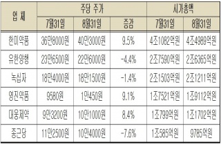 Áö³ 8¿ù ½Ã°¡ÃÑ¾× »óÀ§ Á¦¾à»çµéÀÇ ÁÖ°¡¿¡ Èñºñ°¡ ¾ù°¥·È´Ù. Çѹ̾àǰ, ¿µÁø¾àǰ, ´ë¿õÁ¦¾à µîÀÇ ÁÖ°¡´Â »ó½ÂÇÑ ¹Ý¸é Á¾±Ù´ç, .2017-09-01 12:14:00