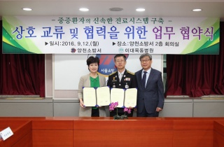 ÀÌ´ë¸ñµ¿º´¿øÀº 12ÀÏ ¼¿ï ¾çõ¼Ò¹æ¼¿Í Àç³ ¹ß»ý ½Ã ÁßÁõȯÀÚÀÇ ½Å¼ÓÇÑ Áø·á¸¦ À§ÇÑ MOU¸¦ ü°áÇß´Ù. À̹ø Çù¾àÀº ÀÌ´ë¸ñµ¿2016-09-13 10:48:10