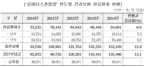 ¼Õ¸¶µð°¡ º×°í ¾ÆÇ ·ù¸¶Æ¼½º°üÀý¿° ȯÀÚ°¡ ¸Å³â ²ÙÁØÈ÷ Áõ°¡ÇÏ´Â °ÍÀ¸·Î ³ªÅ¸³µ´Ù. ƯÈ÷ °í·É ¿©¼ºÈ¯ÀÚ°¡ ¸¹¾Æ ÁÖÀǰ¡ ¿ä±¸µÈ´Ù2016-01-10 13:18:39