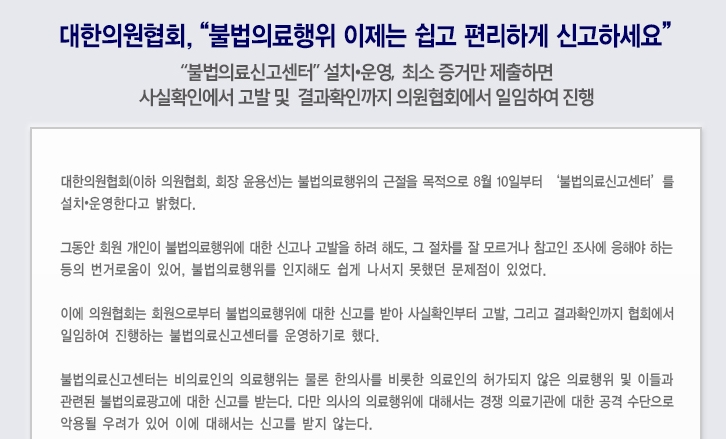 ´ëÇÑÀÇ¿øÇùȸ(ȸÀå À±¿ë¼±)°¡ ¿À´Ã(12ÀÏ)ºÎÅÍ 'ºÒ¹ýÀÇ·á½Å°í¼¾ÅÍ'¸¦ ¼³Ä¡, ¿î¿µ¿¡ µé¾î°¬´Ù. ±× µ¿¾È ȸ¿ø °³ÀÎÀÌ ºÒ..2015-08-12 11:40:33