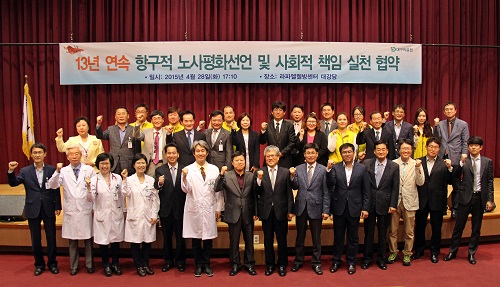 ¼¿ï´ëº´¿ø µî ±¹°ø¸³º´¿ø ³ë»ç°¡ ´ë¸³Çϰí ÀÖ´Â °¡¿îµ¥ ´ë±¸ÀÇ·á¿øÀÌ Àü±¹ °ø±â¾÷ ÃÖÃÊ·Î 13³â ¿¬¼Ó ³ë»ç Æòȸ¦ ¼±¾ðÇØ ±× ¹è.2015-04-29 10:39:04