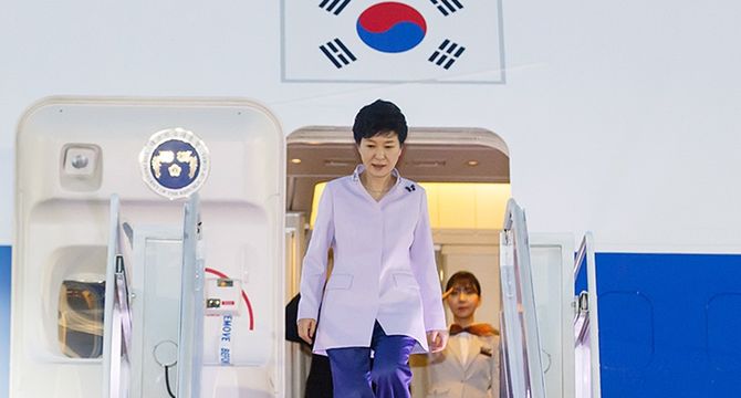 ¡ã¹Ú±ÙÇý ´ëÅë·ÉÀÌ 27ÀÏ ¿ÀÀü ¼¿ï°øÇ׿¡ µµÂøÇÏ¿© Àü¿ë±â¿¡¼ ³»¸®°í ÀÖ´Ù.<»çÁøÃâó û¿Í´ë> Áß³²¹Ì 4°³±¹ ¼ø¹æ2015-04-27 12:31:06