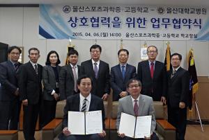 ¿ï»ê´ëÇб³º´¿ø(º´¿øÀå Á¶È«·¡)°ú ¿ï»ê½ºÆ÷Ã÷°úÇÐÁß¡¤°íµîÇб³(±³Àå Á¤Àç¿À)´Â Áö³ 6ÀÏ ¿ï»ê½ºÆ÷Ã÷°úÇÐÁß¡¤°íµîÇб³ ±³Àå½Ç2015-04-07 08:57:37
