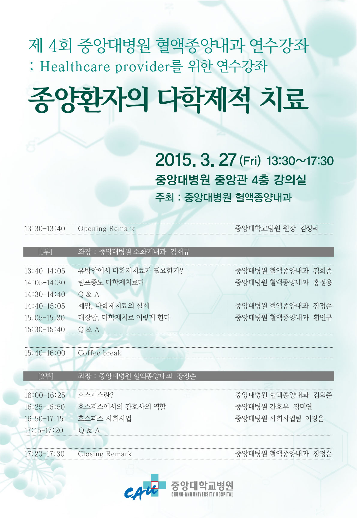 Áß¾Ó´ëÇб³º´¿ø(¿øÀå ±è¼º´ö)Àº ¿À´Â 27ÀÏ(±Ý) ¿ÀÈÄ 1½Ã 30ºÐºÎÅÍ º´¿ø Áß¾Ó°ü 4Ãþ °Àǽǿ¡¼ ¡®Á¦4ȸ Á߾Ӵ뺴¿ø Ç÷¾×Á¾¾ç³»°ú2015-03-05 09:37:15