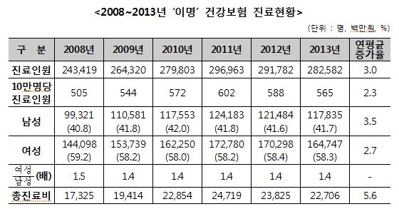 ³Ä¡¼º ÁúȯÀÎ À̸í(±Í ¿ï¸²) ȯÀÚ ¼ö°¡ ÃÖ±Ù 5³â »õ 4¸¸¸í °¡·® Áõ°¡Çß°í ¼ºº°·Î´Â ¿©¼ºÀÌ ³²¼ºº¸´Ù 1.4¹è ÀÌ»ó ¸¹Àº °ÍÀ¸·Î ³ª2015-02-15 12:00:00