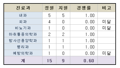 Áø·á°ú Á¤¿ø Áö¿ø °æÀï·ü ºñ°í ³»°ú 15 16 1.07 ¡¡ ¼Ò¾ÆÃ»¼Ò³â°ú 5 6 1.20 ¡¡ ½Å°æ°ú 2 2 1.00 ¡¡ .2014-12-03 19:37:23